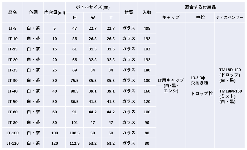 • 5ml~120mlの透明瓶と茶瓶のシリーズです。