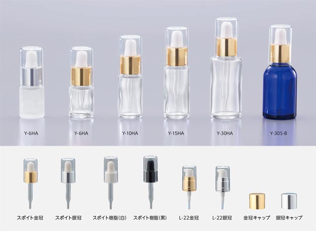 スポイトのほか、ディスペンサー、金・銀冠キャップが装着できるガラス瓶シリーズです。